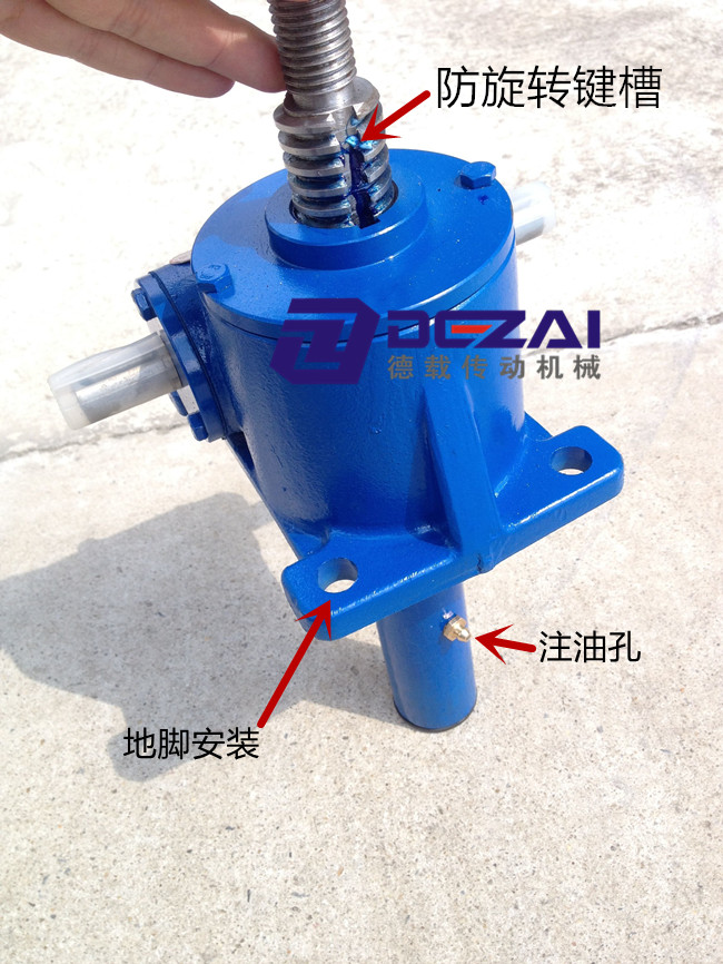 絲桿升降機防旋轉的方式有兩種:1做方形護筒,絲桿尾部加方形擋塊,貼合方形護筒四壁。2絲桿上開通槽,蝸輪與絲桿槽之間加個鍵。